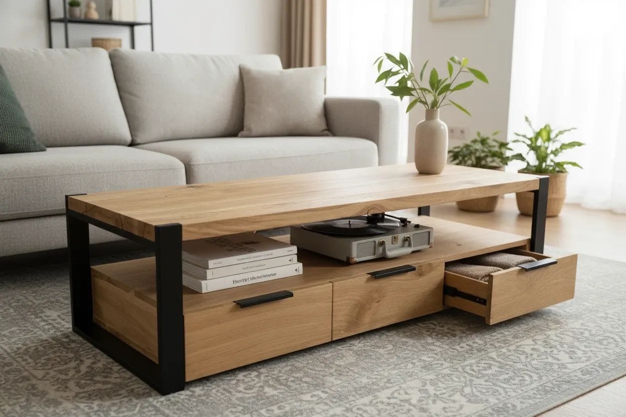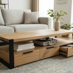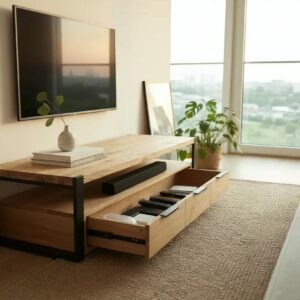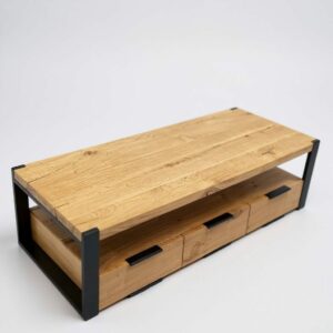Das Lowboard besteht aus Eiche -Massivholz, einem tropischen Hartholz, das sich durch eine ausgeprägte Maserung und eine glatte Textur auszeichnet. Dieses Holz verzieht und spaltet sich nicht und verfügt über eine natürliche Fäulnisbeständigkeit. Daher ist dieser schön gestaltete TV-Tisch äußerst stabil, langlebig und auffällig. Dieser Fernsehschrank ist vollständig handgefertigt und die ästhetisch ansprechende Holzmaserung macht jedes Möbelstück unverwechselbar. Dieser TV-Schrank verfügt über 3 Schubladen und 1 Fach, die reichlich Platz für die Aufbewahrung von elektronischen Geräten, Büchern und anderen Gegenständen bieten.