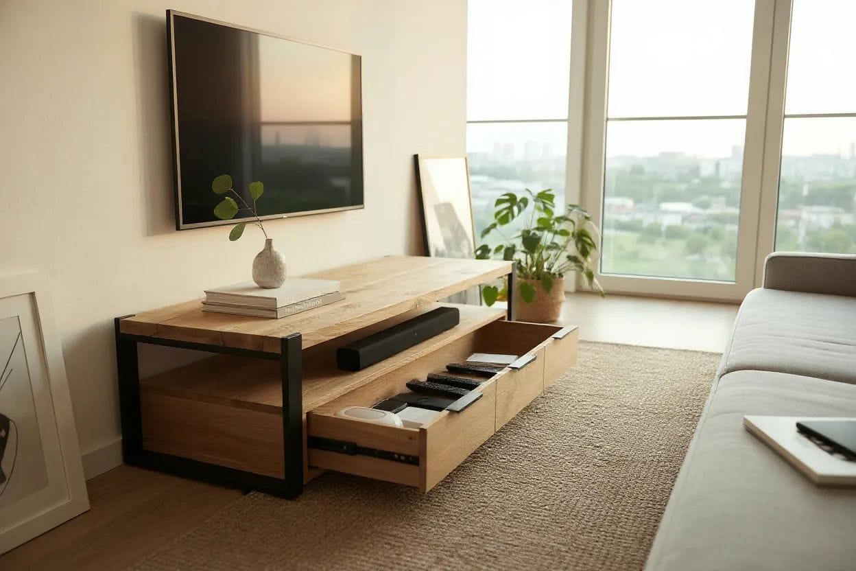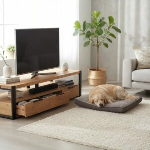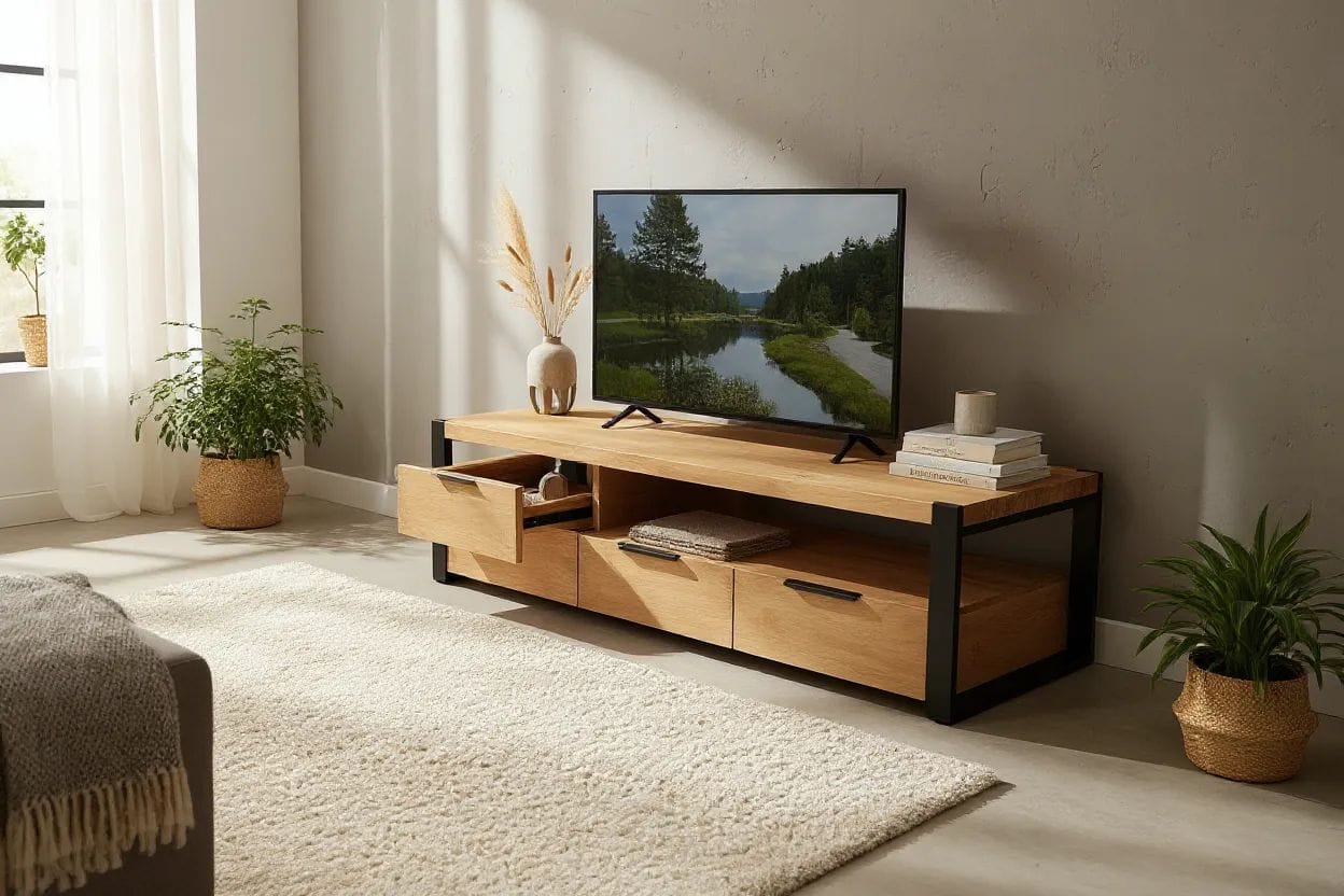 Dieser TV-Schrank aus Massive Eiche Holz strahlt einen rustikalen Charme aus und wird zum Blickfang in deinem Interieur.