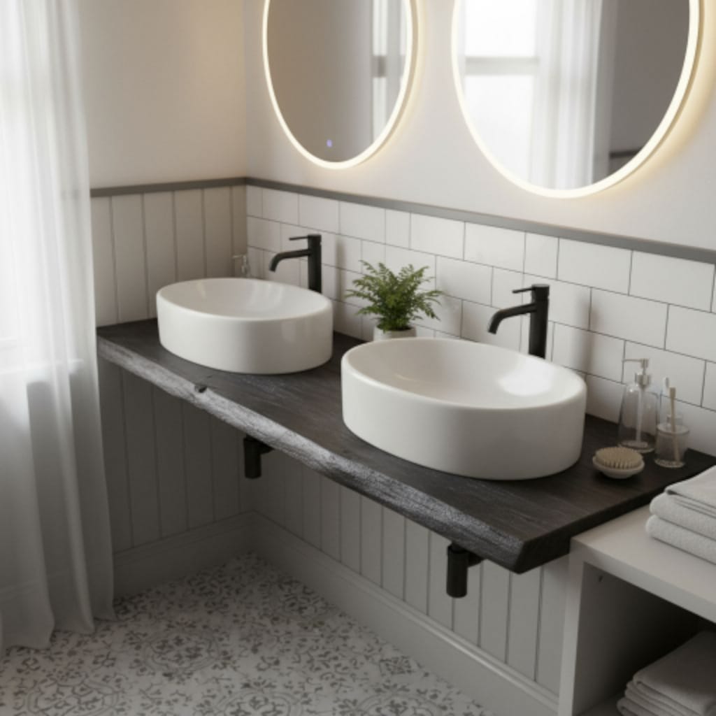 Unsere Platten können Sie nicht nur als Waschtischplatte verwenden sondern auch als Wandregal im Wohnzimmer, Küche oder Flür