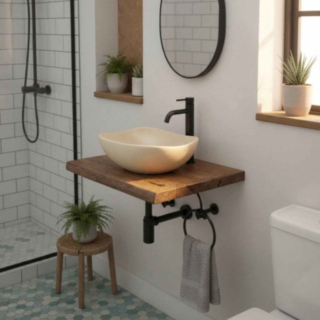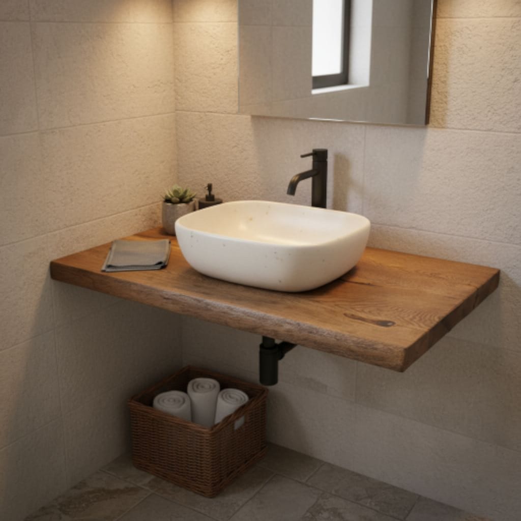 Unsere Platten können Sie nicht nur als Waschtischplatte verwenden sondern auch als Wandregal im Wohnzimmer, Küche oder Flür
